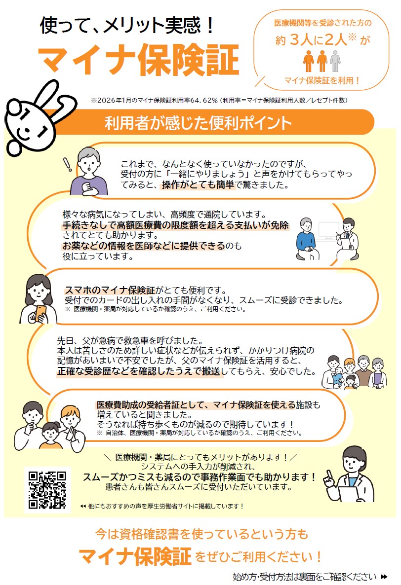 - 薬剤情報や特定健診等情報、診療情報の閲覧(マイナンバーカードを保険証として利用した場合のみ) →これらの情報を取得・活用することにより、質の高い医療の提供に努めています。
