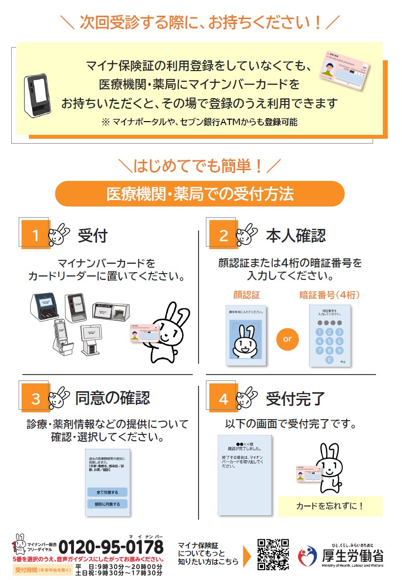 受診の際、マイナンバーカード(または保険証)および各種公費受給者証を必ずご持参ください。